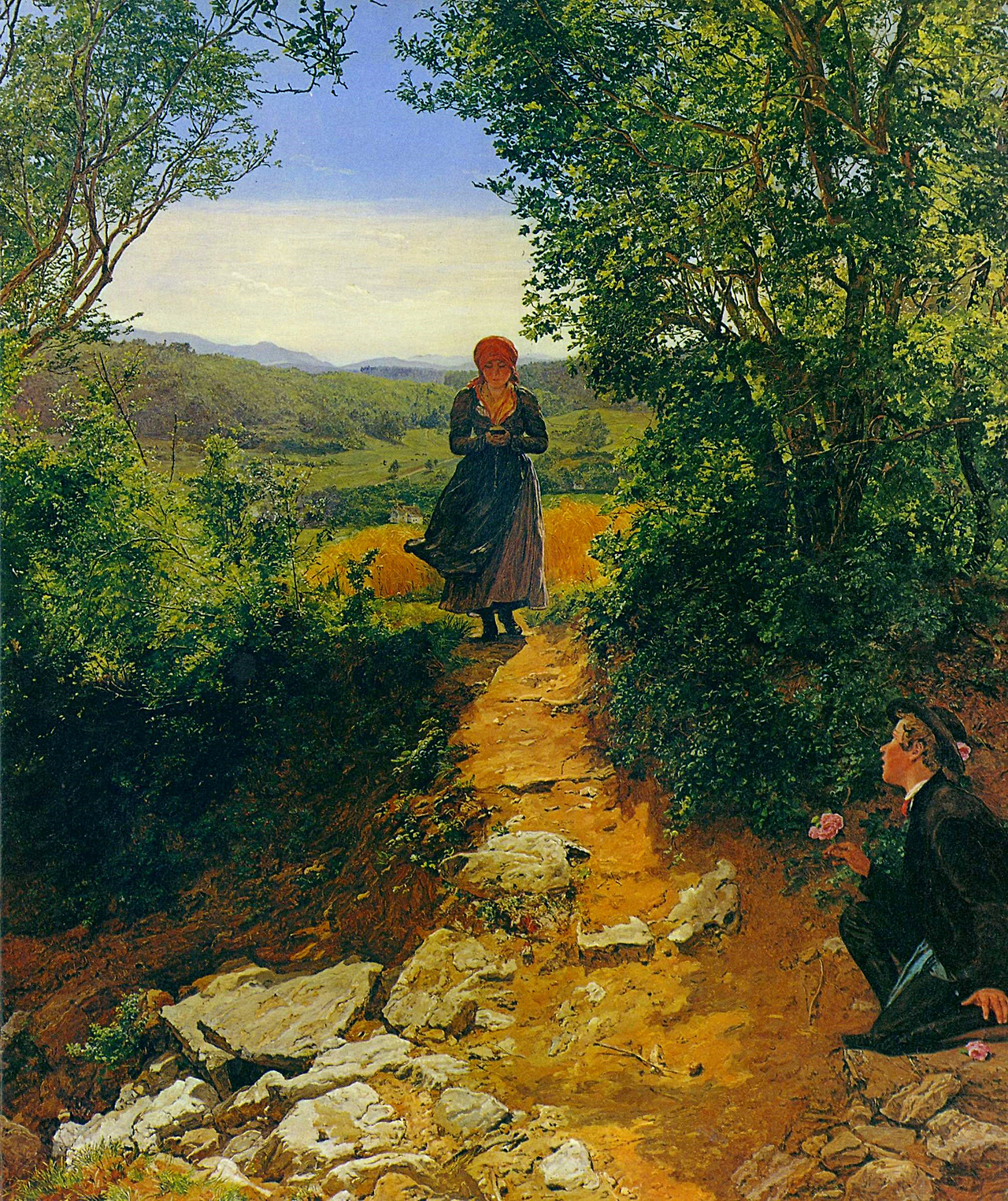 덤불 속에 소년이 웅크리고 있다. 모자에 꽃을 달고 손에도 꽃을 들고 있다. 그리고 또 한 송이는 바닥에도 있다. 다가오는 여자를 위해 완벽하게 준비하고 있다. 금발이 섞인 갈색 머리카락이 보이는 소년의 머리에는 꽃 장식이 있는 멋진 후트 쾨니히 스타일 모자가 씌워져 있다. 어쩌면 아버지로부터 물려받은 물건일지도 모른다.