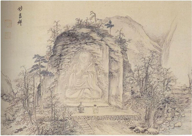 이 그림의 이름은 ‘묘길상도(妙吉祥圖)’인데 깎아지른 자연 바위 암벽에 부처를 부조해 놓은 것이다. 이런 부처를 일반적으로 마애불(磨崖佛)이라고 부른다. 그런데 자세히 부처의 얼굴을 보니 부처인지 아닌지 분명하지 못한 얼굴이다. 본래 부처의 얼굴은 32상 80종호의 원칙으로 그려진다. 32상으로 불상이 모습이 정형화된 데에는 여러 가지 이유가 있겠지만 아마도 불멸 후 부처의 신격화가 그 주요 원인이고 또 다른 원인은 헬레니즘의 영향을 받은 간다라 미술로 정착된 불상이 중국을 거쳐 우리나라에 전파되었기 때문일 것이다.