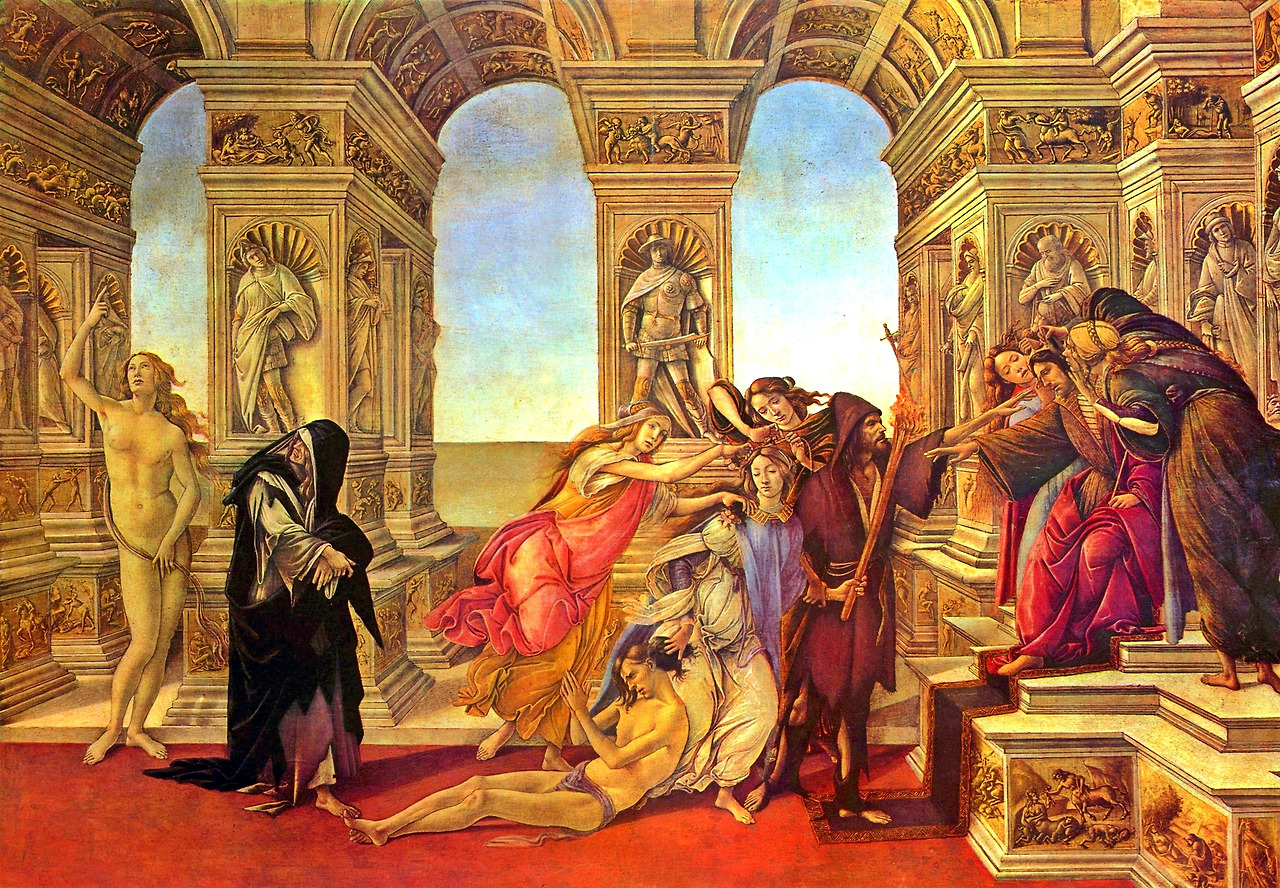 신화적 모티브를 회화에 끌어들임으로 르네상스 회화에 새로운 가능성을 제시한 보티첼리가 루키 아누스가 전하고 있는 아펠레스의 이야기를 어떻게 회화로 표현하고 있는지 살펴보자.