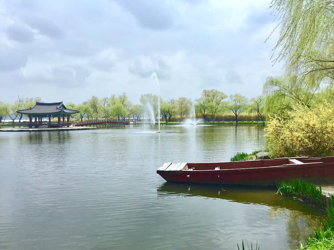역시 아이들은 이 공원에 왜 왔는지 무엇을 보라는 것인지 의아스러운 표정이다. 연꽃의 잔해만 잔뜩 남은 연못과 특별할 것 하나도 없는 정자(이름은 거창하게 포룡정이다.)를 보며 나 역시 이 궁남지를 여행 코스에 넣은 것에 대하여 조금은 의문스러웠다. 하지만 봄의 정취를 느끼기에는 그만인 장소인 듯했다. 개나리가 피어나고 동시에 초록이 돋는 궁남지에서 나는 몇 개의 감정을 추려서 이런 시 한 편을 썼다.