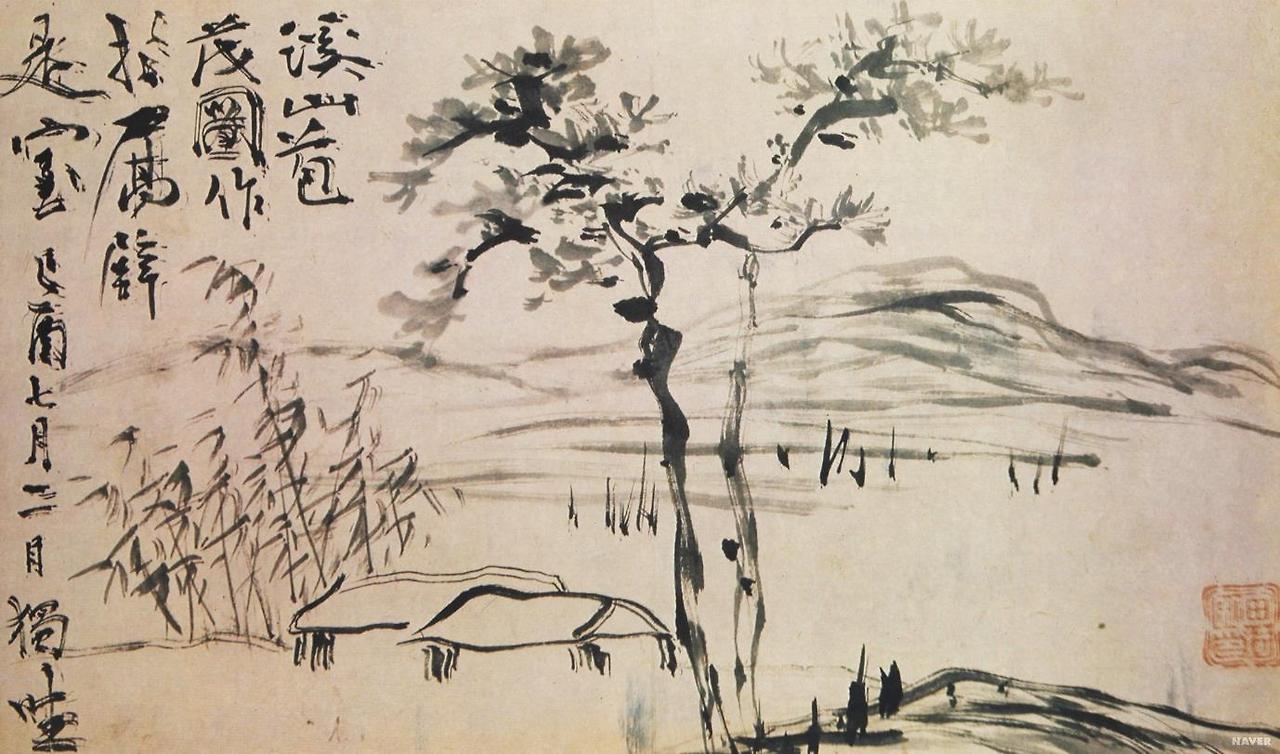 뒤로 보이는 산은 비교적 낮다. 계산을 보는 전기 자신의 마음의 높이가 소나무처럼 높았다가 산처럼 낮아진다. 바로 이것이 이 그림의 매력인지도 모른다. 마음의 모습처럼 도저히 具顯낼 수 없는 관념의 세계를 전기는 과감한 생략과 실험적인 구도, 그리고 대담한 글씨를 모아 그림에 담아내고 있다. 계곡과 산이 어우러진 일반적인 산수화가 가지는 세련되고 풍부한 맛은 그대로 의미가 있다. 하지만 이 그림처럼 계곡은 도저히 가늠하기 어렵고 산은 수려할 것 같지도 않은데 문득 그림 중간에 우뚝 소나무를 그려놓았다. 왠지 지독한 슬픔이 밀려온다. 요절한 자의 슬픔인가?