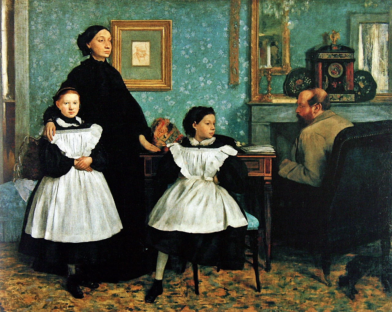 가족사진처럼 보이는 그림이지만 분위기는 차분하다 못해 엄숙하고 경직된 모습이다. 특히 서 있는 드가의 고모는 시선을 멀리 고정한 채 어두운 기색이 역력하다. 그 이유는 검은 상복에서도 알 수 있듯이 그녀의 뒤로 보이는 작은 액자에 걸린 그녀의 아버지(드가의 할아버지 Hilaire Degas)가 사망한 지 얼마 되지 않은 탓도 있고, 남편과의 성격차이로 행복하지 않은 결혼 생활을 하고 있었던 탓도 있다.