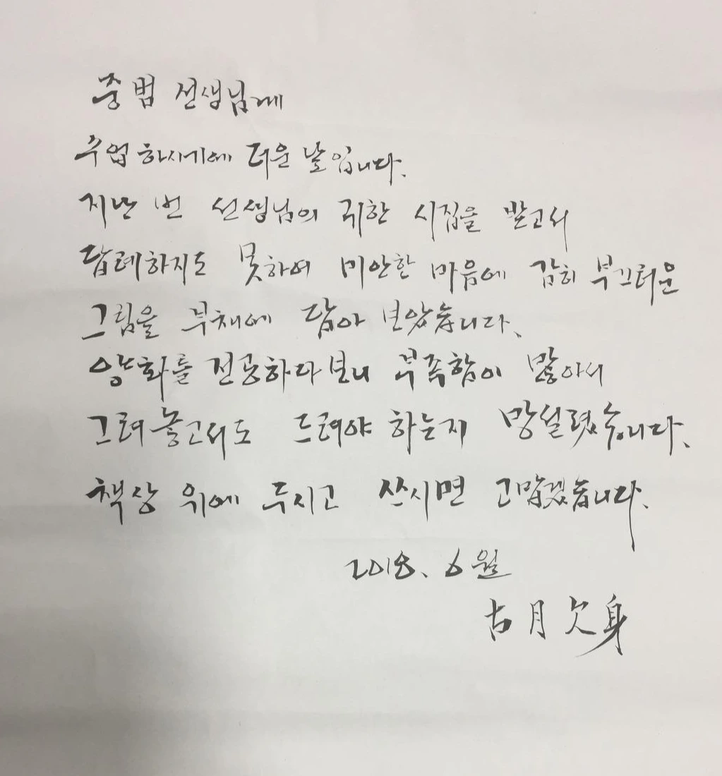 2018년 6월 26일 오후, 귀하고 고운 선물을 받았다. 한 획 한 획 그리고 쓰셔서 마음을 담아 주셨는데 다만 보답할 길이 없어 형편 없는 글로 대신하려 한다.