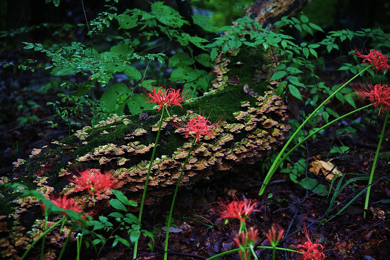 2018년 9월 15일 함양 상림, 해마다 보는 석산(꽃무릇)이지만 해마다 그 느낌은 다르다. 이미 오래전에 쓰러져 온 몸에 버섯이 나고 형체조차 조금씩 뭉그러지는 나무를 배경으로 문득 붉은 석산이 피어났다. 지금의 시공간을 넘어 전혀 독립적인 시공간이 창조된 것처럼 아름답고 어울리는 풍경이다.