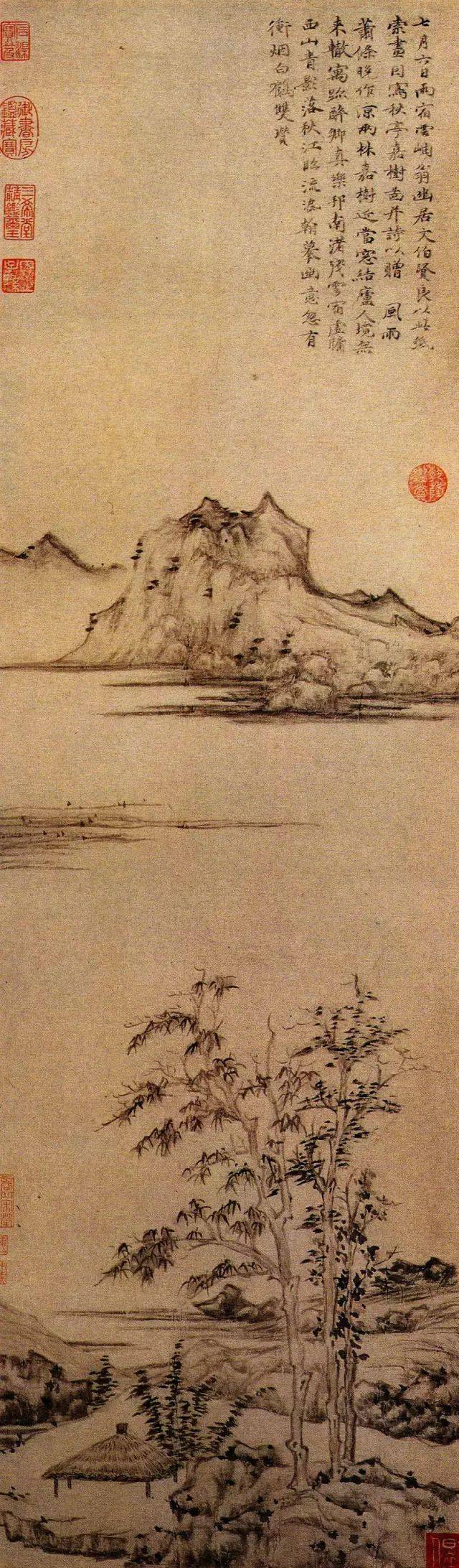 文伯賢良以此紙索畫,因寫秋亭嘉樹圖並詩以贈。風雨蕭條晚作涼,兩株嘉樹近當窗。結廬人境無來轍,寓跡醉鄉真樂邦。南渚殘雲宿虛牖,西山青影落秋江。臨流染翰摹幽意,忽有沖煙白鶴雙