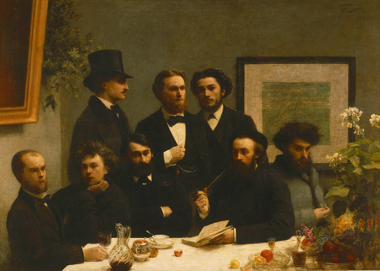 첫 번째는 그가 스승 쿠르베만큼 존경하는 Eugène Delacroix(들라크루와)를 위해 그린 Hommage à Delacroix(들라크루와에게 보내는 경의, 1864)이며 두 번째는 Un atelier aux Batignolles(바티뇰 작업실에서의 모임, 1870)으로서 그의 스승 Édouard Manet(마네)에 대한 헌사였다. 세 번째가 이 그림으로서 당시 파리의 저명인사(개혁적 인물)들을 그렸는데 이 모임은 Charles Baudelaire(샤를 보들레르)를 위한 모임이었다. 따라서 모인 사람들 중 2~3명을 제외하고는 모두 시인이었는데 그중, 폴 베를렌, 아르튀르 랭보는 직접적으로 보들레르의 낭만적이며 심지어 악마주의적인 시적 이미지를 확장시킨 사람들이었다.