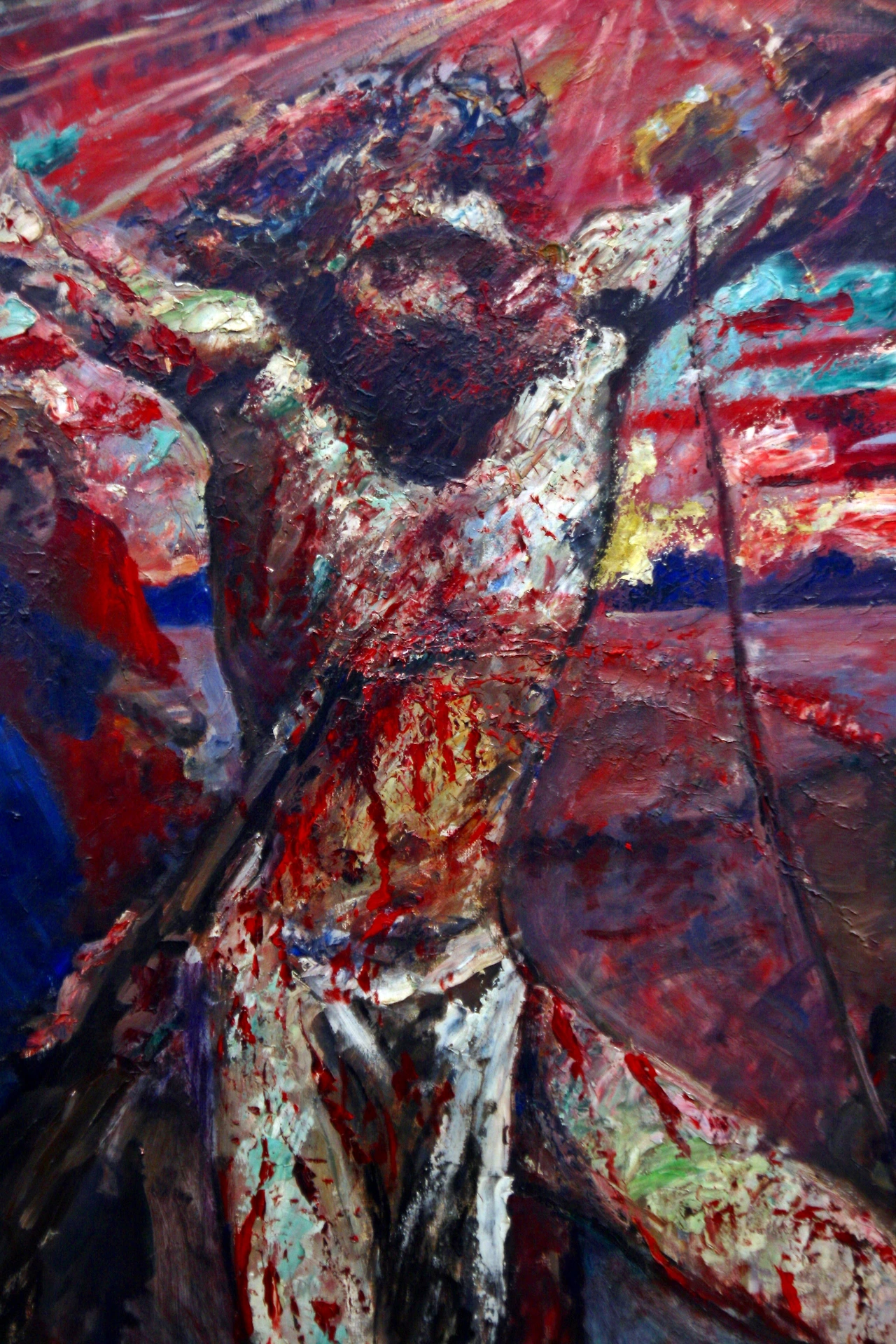 사방으로 붉은 피가 낭자하다. 화면 밖으로 튀어나올 것 같은 기세의 핏방울은 태양 빛을 더 붉게 만들었고 세상의 모든 것들을 붉게 보이게 한다. 창이 가슴을 찌르고 그 상처에서 몸 밖으로 뿜어져 나오는 핏방울의 주인공은 당연히 골고다 언덕에서 십자가에 못 박혀 죽은 예수 그리스도이다. 죽어가는 예수 뒤로 아들의 처절한 죽음을 보는 마리아의 절규가 보인다.