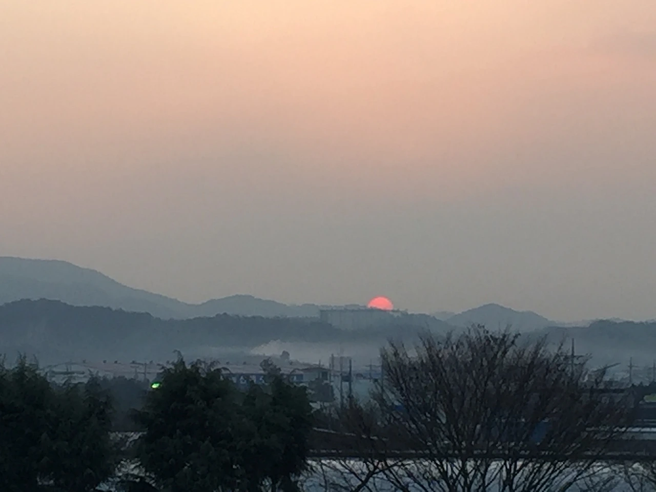 2018년 12월 19일 오전 7시 45분경, 아침 일찍 등교하여 3층에서 멀리 월아산 일출을 보다. 태양 주위를 도는 지구의 공전 속도는 어마어마하게 빠르지만(초속 약 29783 km) 자전 속도 또한 빠르다. 초속 465.11m(시속으로 바꾸면 약 1674km)이다. 해 윗부분이 잠시 보이더니 어느새 해가 떠 오르고 말았다.