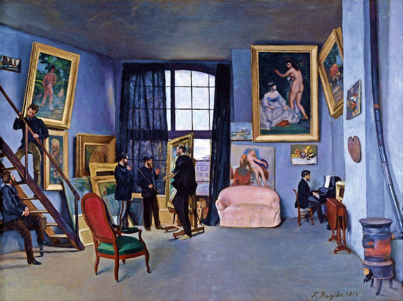 왼쪽 계단 밑에 앉아 있는 사람이 Pierre Auguste Renoir(르느와르)이고 그 위 계단에 서 있는 사람은 유명한 저술가이자 소설가이며 평론가인 Emile Zola(에밀 졸라)이다. 그다음은 이들보다는 나이가 많은 Eduard Manet(에두아르 마네)와 모자를 쓴 아직은 30대인 Claude Monet(끌로드 모네)가 서있다. 그다음이 이 방의 주인인 바지유 자신인데 자신이 얼마 전 그린 그림을 여러 사람에게 설명하고 있다. 피아노를 치는 사람에 대해서는 알려진 사실이 없으나 당시의 저명한 음악가 중의 한 명이었을 것이다.
