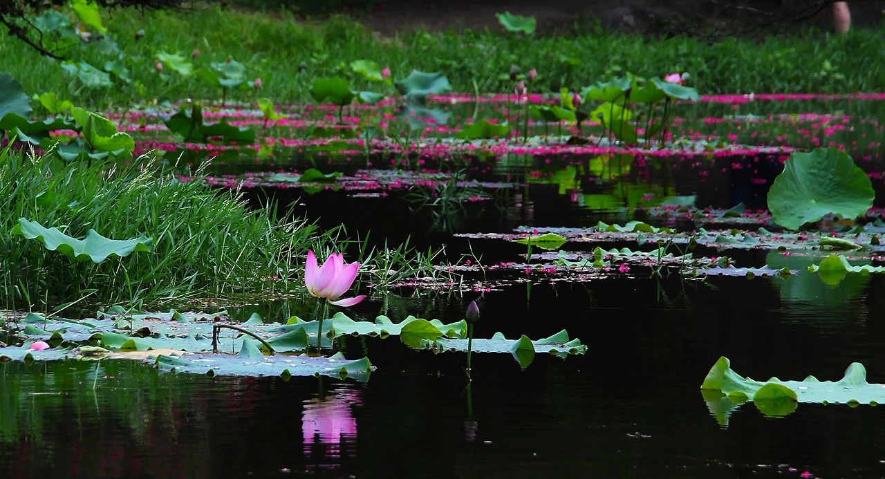 * 風景에서 ‘풍’은 가로의 변화를 의미한다. 물결의 살랑거림에 나타나는 분홍빛 연꽃 그림자의 일렁임과 강렬하게 붉은 배롱나무 꽃잎, 그리고 대조적인 푸른 연 잎. 더불어 검은 웅덩이 물빛이 병렬적으로 이어지는 것이 이를테면 ‘풍’이다. 그와 반대로 ‘경’은 세로적 이미지다. (물론 그림자라는 의미도 있다.) 드리워진 배롱나무 가지에서 떨어지는 꽃잎의 낙하와 수면에 비친 연 잎과 그 밑으로 이어지는 연 꽃의 반영, 그리고 수직으로 드리워진 하늘을 ‘경’으로 볼 수 있다. 이런 느낌은 오로지 시각에서 끝나는 것이 아니라 청각, 즉 음악적 뉘앙스로 연결되기도 한다. 대자연에는 항상 푼크투스 콘트라 푼크툼(punctus contra punctum, 대위)의 미묘함이 숨겨져 있다.