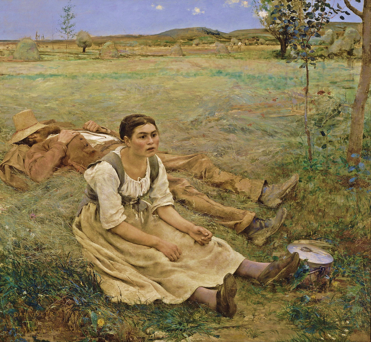 쾡하게 패인 처녀의 눈에서 미래에 대한 걱정이 느껴진다. 옆에 모자를 덮고 누운 남자는 아버지처럼 보이는데 해진 옷과 낡아빠진 신발에서 가난이 그대로 느껴진다. 수확을 끝내고 건초를 만드는 작업 사이를 절묘하게 포착한 르파주의 이 그림은 번성했던 퐁텐블로 숲의 바르비종파의 향기를 그대로 느낄 수 있다.