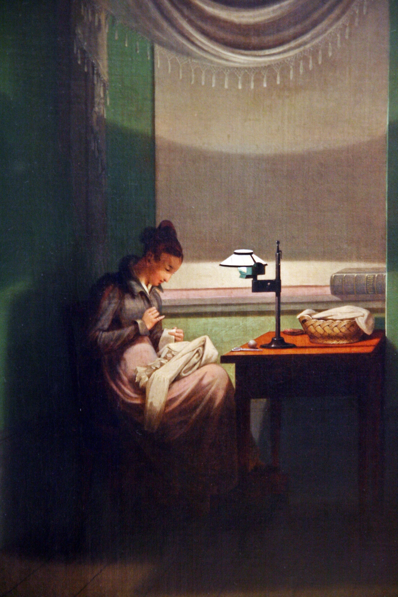 매우 현대적인 느낌이 나는 스탠드 밑에서 바느질하는 여인이 있다. 등불은 바느질하기에 충분히 밝다. 탁자 위에는 가위며 실 꾸러미가 보이고 약간은 희미하지만 스탠드 옆으로 옷을 재단하는데 필요한 핀 꽂이도 보인다. 아마도 바느질을 전문적으로 하는 사람인 모양인데 바구니에 아직 해야 할 일감이 조금 있어 보인다. 그 위로 두꺼운 성경도 보인다.