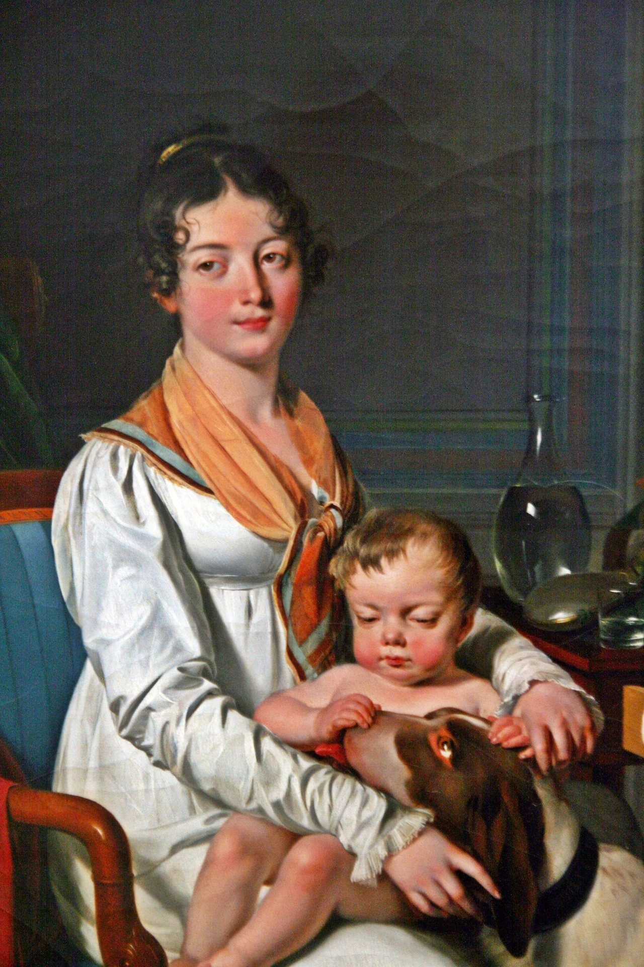 물병과 컵이 있는 탁자 위에 작은 여성용 지갑이 놓여 있다. 볼 살이 통통한 아기가 애완견을 만지고, 엄마는 어쩐 일인지 아기는 쳐다보지 않고 정면의 약간 위 쪽을 응시하고 있다. 목에 두른 스카프와 헤어 스타일, 그리고 애완견으로 보아 19세기 초 산업혁명으로 부를 축적한 유럽의 중산층 여인임을 알 수 있다. 그 유력한 증거는 탁자 위의 유리 병과 유리컵인데, 19세기 초, 유리는 역시 산업화의 덕으로 왕족이나 귀족 가문으로부터 중산층까지 널리 쓰이기 시작했다.