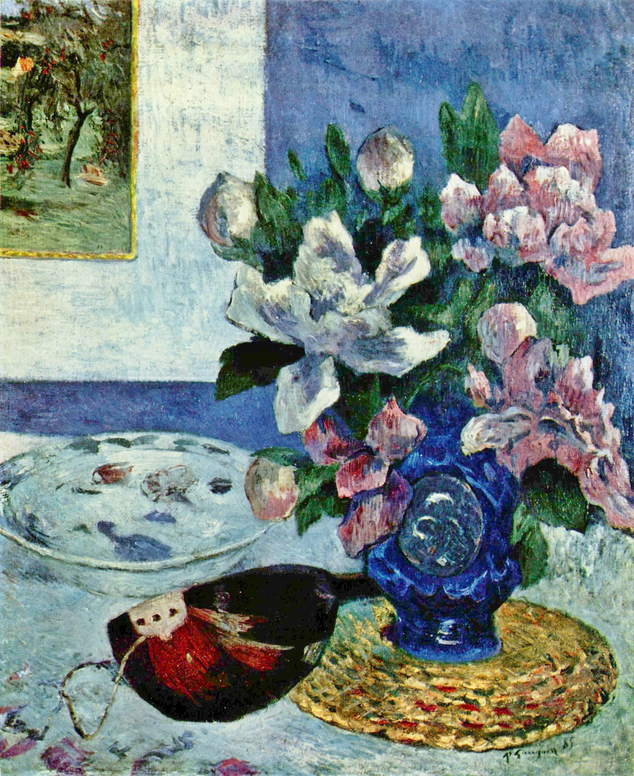 덴마크의 코펜하겐에서 결혼 생활을 하던 고갱은 1885년 다시 파리로 돌아온다. 그 해 그린 이 그림, Nature morte a la mandolin(만도린이 있는 정물)은 아직은 완숙기에 접어들지 못했던 고갱의 그림으로서 인상주의 회화가 가지는 사물에 주관적 묘사와 사물에 닿아 반사되는 빛을 사용하기는 하였으나, 전체적으로 약간은 어눌한 느낌과 둔탁함이 있다. 특히 바닥에 놓여있는 만도린의 짙은 색상이 그림의 무겁게 하고 있는데 이러한 경향은 이후 고갱이 완숙기로 접어들면서 오히려 고갱 특유의 채색방법으로 자리잡기도 한다. 정물(靜物– still life , nature morte)에 대한 표현은 일본풍의 영향과 함께 이후 고갱의 회화적 표현 방법인 구획 주의(Cloisonnism)의 희미한 그림자가 느껴지기도 한다.