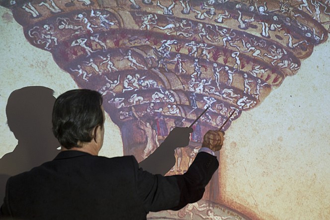 단테의 신곡 중 지옥(La Divina Comedy: Inferno)은 전체 아홉 편으로 구성되어 있다. 영화에서 보티첼리의 그림처럼 깔때기 모양의 지옥을 9단계로 나누는데 제1옥(獄) : Limbo, 제2옥(獄)∼제5옥(獄) : 상부 지옥, 제6옥(獄)∼제9옥(獄) : 하부 지옥으로 나눈다. 단테가 생각한 징벌은 철저한 동해보복이 원칙이다.(역으로 완전히 상반되는 벌칙도 있다.) 단테는 로마의 위대한 시인 베르길리우스(Publius VergiliusMaro)와 함께 지옥을 여행하며 지옥을 묘사한다. 그런데 영화는 지옥도만 보여주고 왜 지옥도를 보여주는지에 대한 극적인 당위성을 설명하지 않아 오히려 보티첼리의 지옥도는 매우 뜬금없이 느껴졌다.