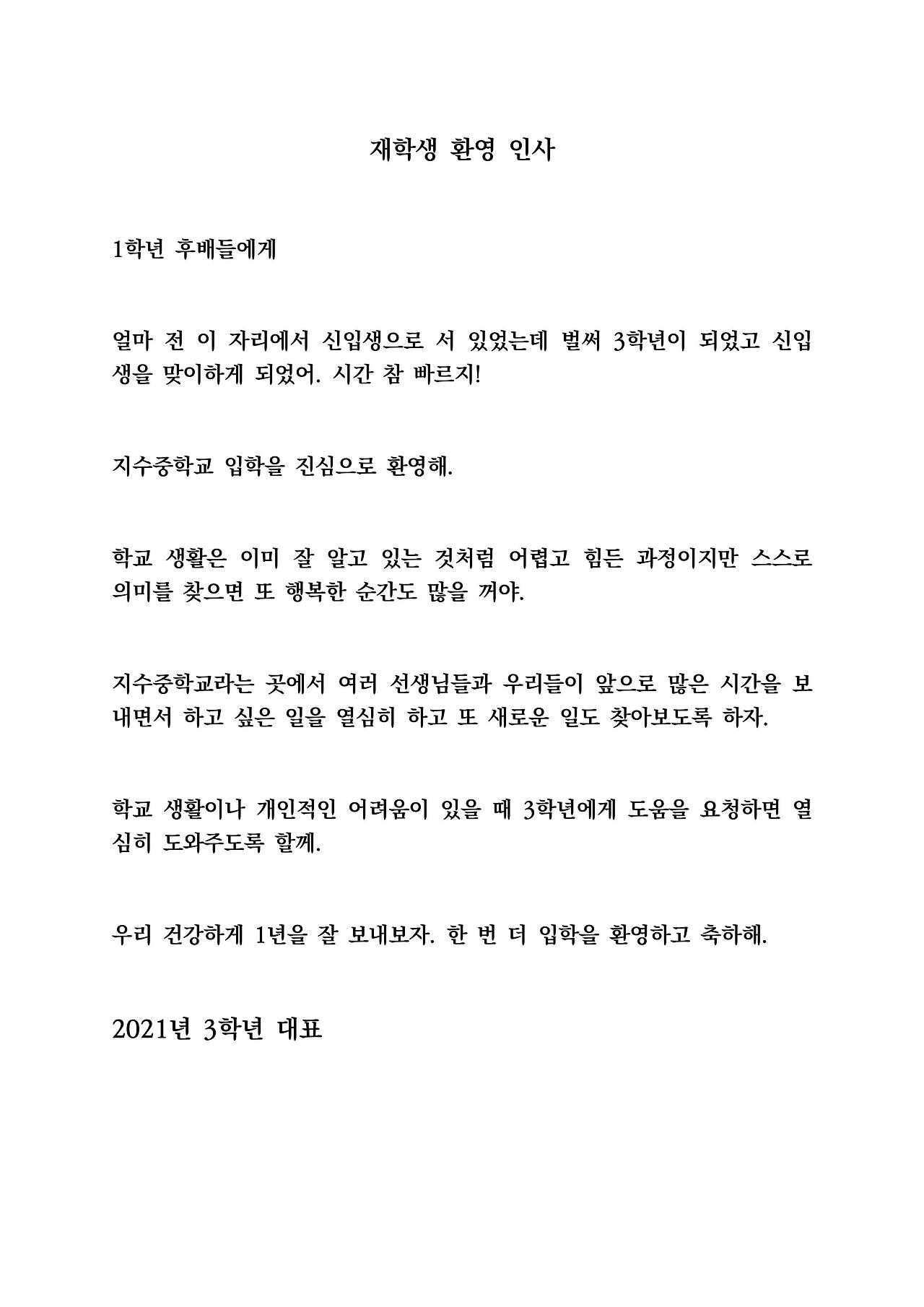 - 재학생 환영 말: 3학년 대표가 아주 잘 읽어 주었다.