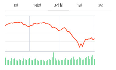 옆에 있는 그림은 최근 3개월 동안에 코스피 지수를 나타내는 그래프이다. 2월까지는 잔잔한 파도의 물결이었다가 3월에 진입하고서 큰 폭으로 떨어졌다. 저 시기가 유럽과 뉴욕 그리고 일본의 코로나 19 확진이 빨라질 시기 었다. 어느 나라 할 것 없이 세계의 모든 나라의 주가 지수가 큰 폭으로 떨어졌다. 그렇게 세계 경제마저 흔들리고 있다.