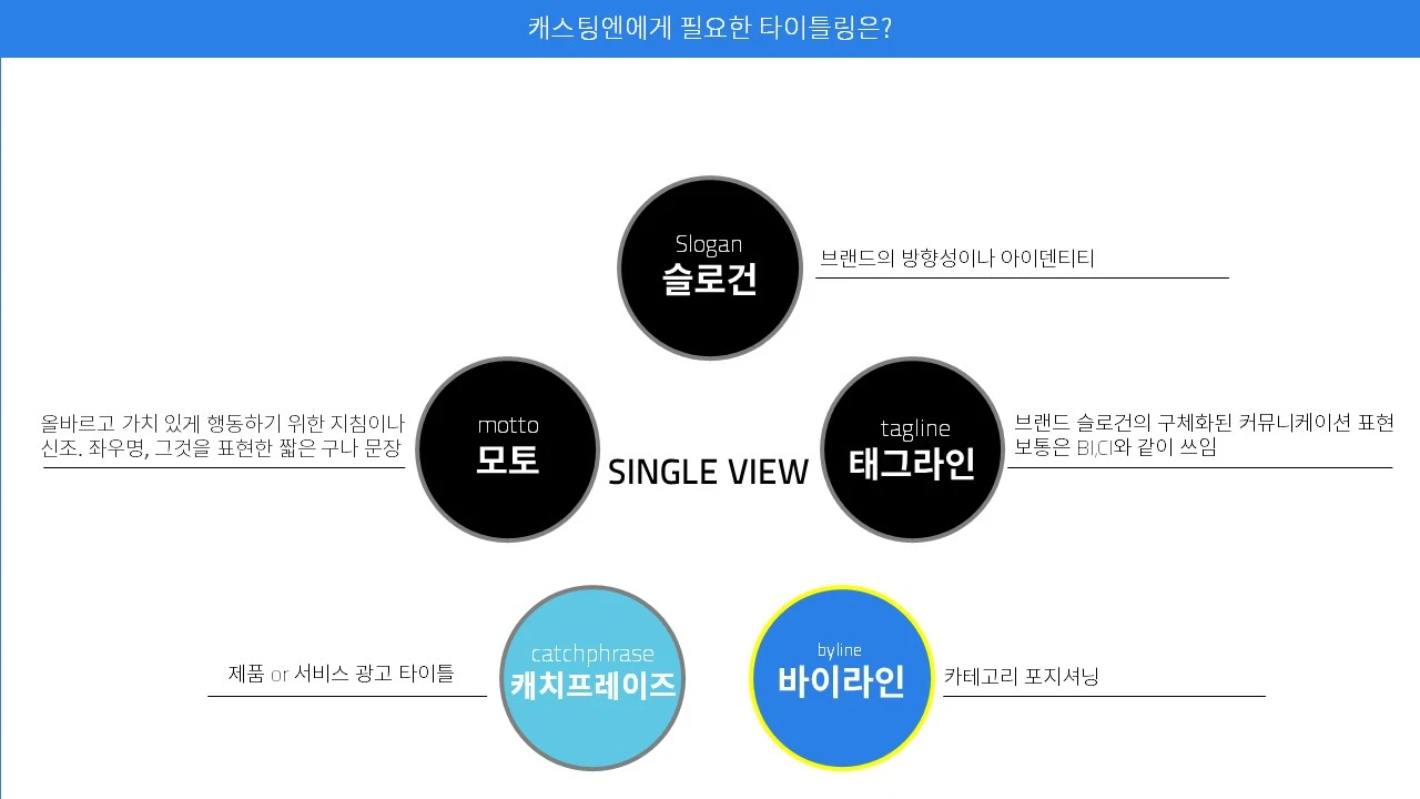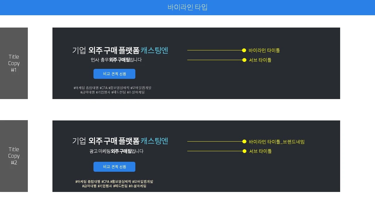 바이라인 : 태그라인과 유사하다, 제품 서비스의 카테고리나 사업 영역을 알리기 위해 사용한다.