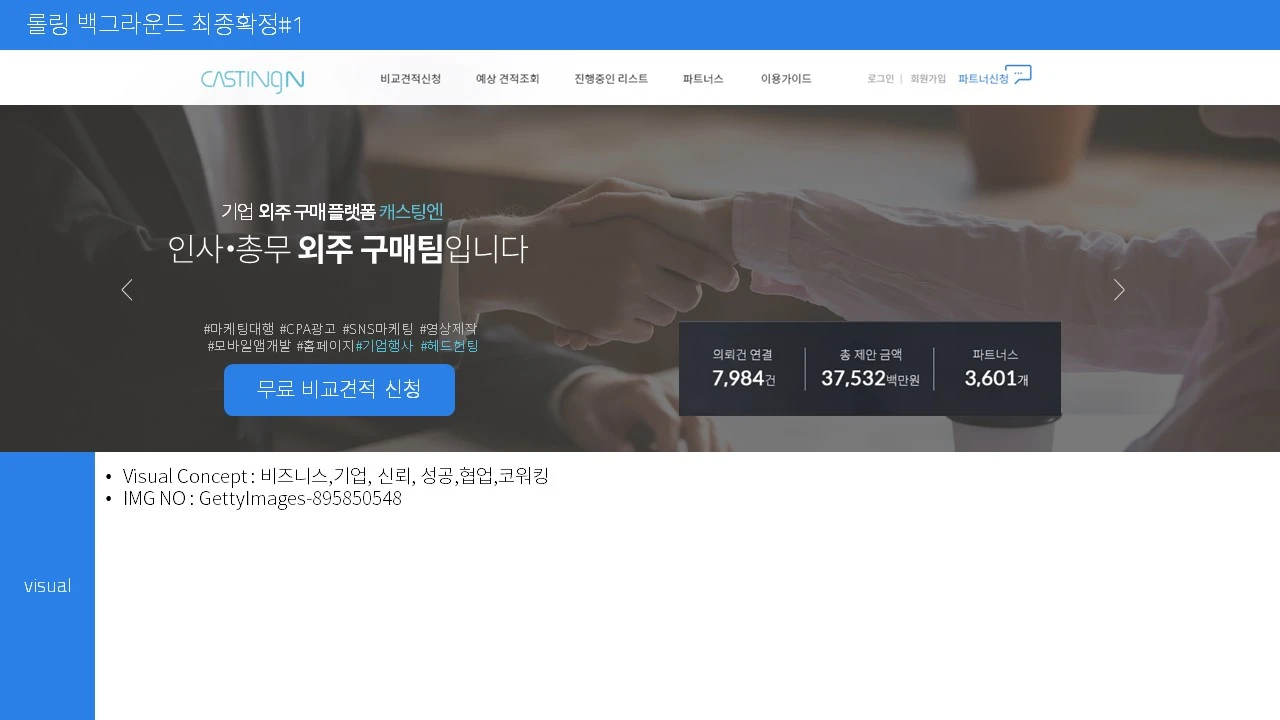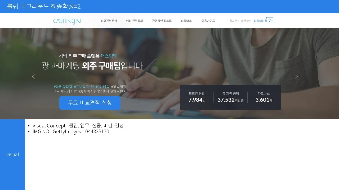 지금까지 브랜드 콘셉트에 맞는 메인타이틀 카피와 이미지 콘셉트를 살펴보았다. 캐스팅엔은, 특성이 다른 카테고리를 플랫폼에 담다 보니 하나의 타이틀 카피로 서비스를 담는 것에 어려움이 많았다. 이 경우에 취할 수 있는 선택지는 많지 않다. 그래서 우리는 바이라인 타입으로 서비스를 묶고 역할론적 슬로건과 백그라운드 이미지의 롤링으로 이용자 맥락에 좀 더 다가가기로 했다.