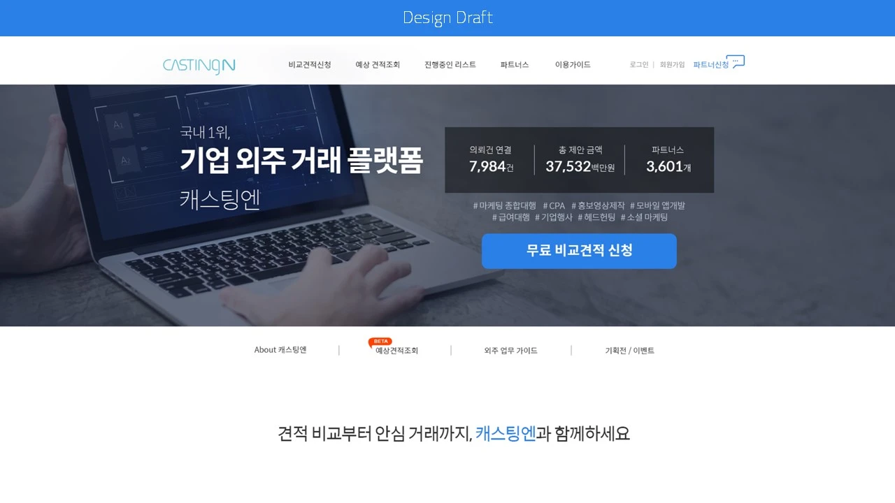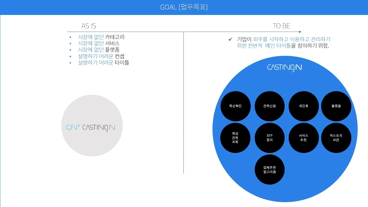 캐스팅엔은 기업 외주 O2O 분야 최초 서비스다. 이런 경우를 보통 example 서비스라고 말한다. 그렇지 않아도, 창업 초기부터 회사를 소개하는 것에 적잖은 어려움을 겪고 있던 터다. 최초라는 기회만큼 고단함도 크다.