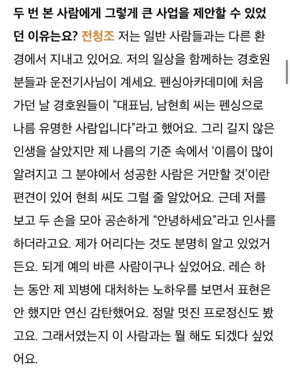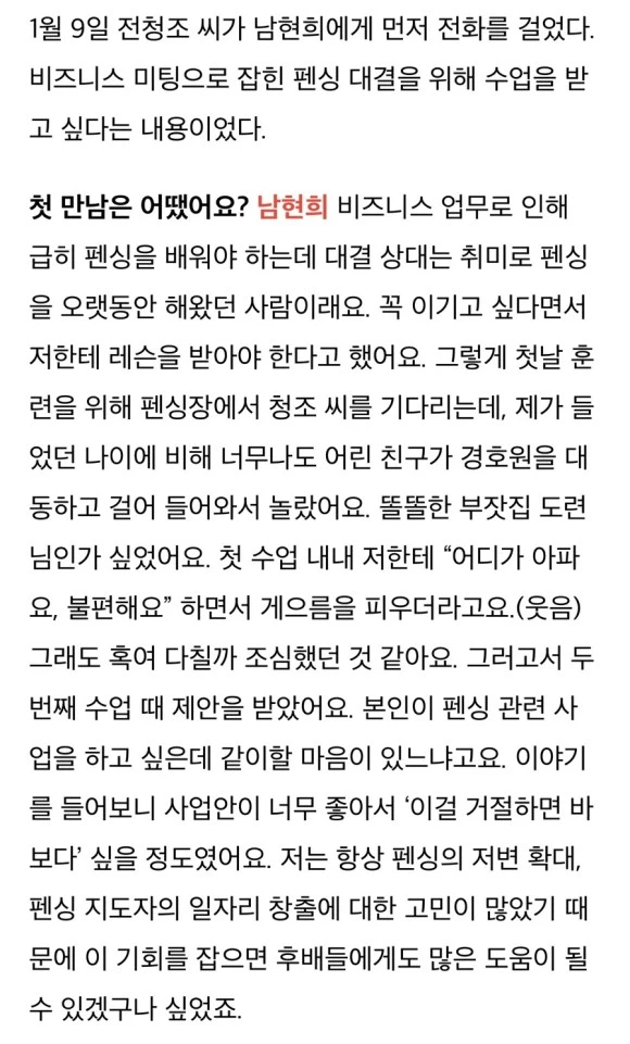 기자의 필력 때문인지 언론사가 주는 신뢰감 때문인지, 인터뷰를 진행한 남현희와 전청조의 말이 그럴듯하게 들렸다. 기사를 읽으면서 ‘왜 굳이 언론에 재벌 3세라고 하면서 어느 기업인지 나와 있지가 않지?’ ‘글로벌 IT기업 임원을 27살에 했다고?’ ‘돈이 많아서 내가 잘 모르는 글로벌 IT기업에 부모님이 꽂아 준 건가?’ 여러 가지 생각이 들었다. 하지만 남현희 씨가 어련히 잘 알고 하지 않았겠냐는 생각이 들면서 그냥 재미있게 기사를 읽었다. 스포츠 심리예절 교육을 한다고 하니, ‘재벌가에서 하는 거라 좀 다른가?’라는 생각도 들고, 뭐 그냥 잘 살아라 하고 넘겼다. 아 그리고, 외모가 너무 어려서 초등학생인 줄 알았다. 뭔가 이상하다는 느낌만 물씬 풍겼지만, 뭐 모르는 분의 결혼이니 기사만 읽고 넘겼다.