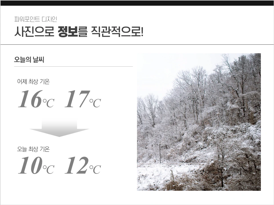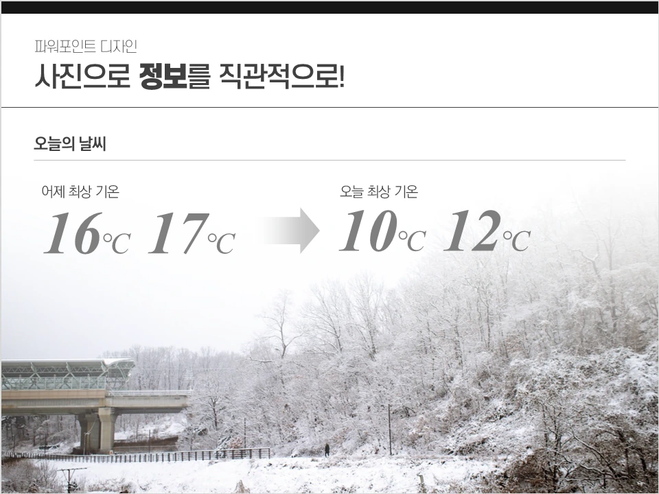 사진은 정보를 가장 직관적으로 전달하는 요소다. 잘 찍은 사진 하나는 어떤 설명이나 그림보다 정확하고 빠르게 내용을 이해시킨다. 그리고 파워포인트에서 사진은 비교적 짧은 시간에 완성도 높은 디자인을 만들게 해준다. 좋은 사진은 전체 형태나 아이콘에 대한 고민을 덜어주고, 그 자체로 있어 보이는 디자인을 완성한다. 잘 나온 사진 하나에 텍스트 몇 줄 넣은 멋진 PPT를 많이 봤을 것이다. 하지만 그런 슬라이드도 막 만든 것은 아니다. 그 안에는 레이아웃이나 대비에 대한 고민이 들어있다. 그래서 알아두면 유용한 PPT 사진활용팁 몇 가지를 소개한다.