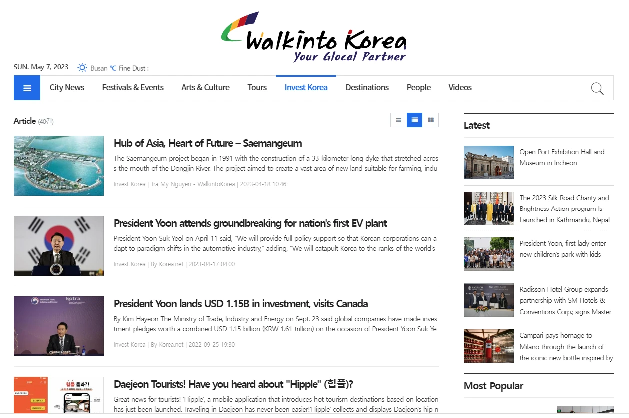 (글로컬 파트너인 다국어 미디어인 워크인투코리아는 지방도시의 투자유치를 위한 Invest Korea 셔션을 운영하고 있다.)
