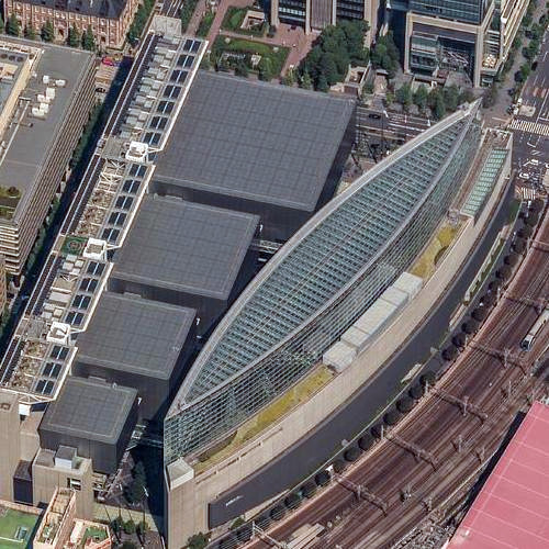(하늘에서 내려다본 도쿄포럼, 땅값이 비싸기로 유명한 도쿄 중심지에서 철로를 등으로 대고 절묘하게 설계했다. 건물 동은 내부에서는 연결하였지만, 지상에서는 분리하여 건물 동 간격을 오솔길처럼 다용도로 사용할 수 있다. 만약 한 통으로 지었다면 거리로 이어지지 않고, 지역과 소통하기 어려운 폐쇄형 성(城)이 되었을 것이다, 사진출처, virtualglobetrotting.com)