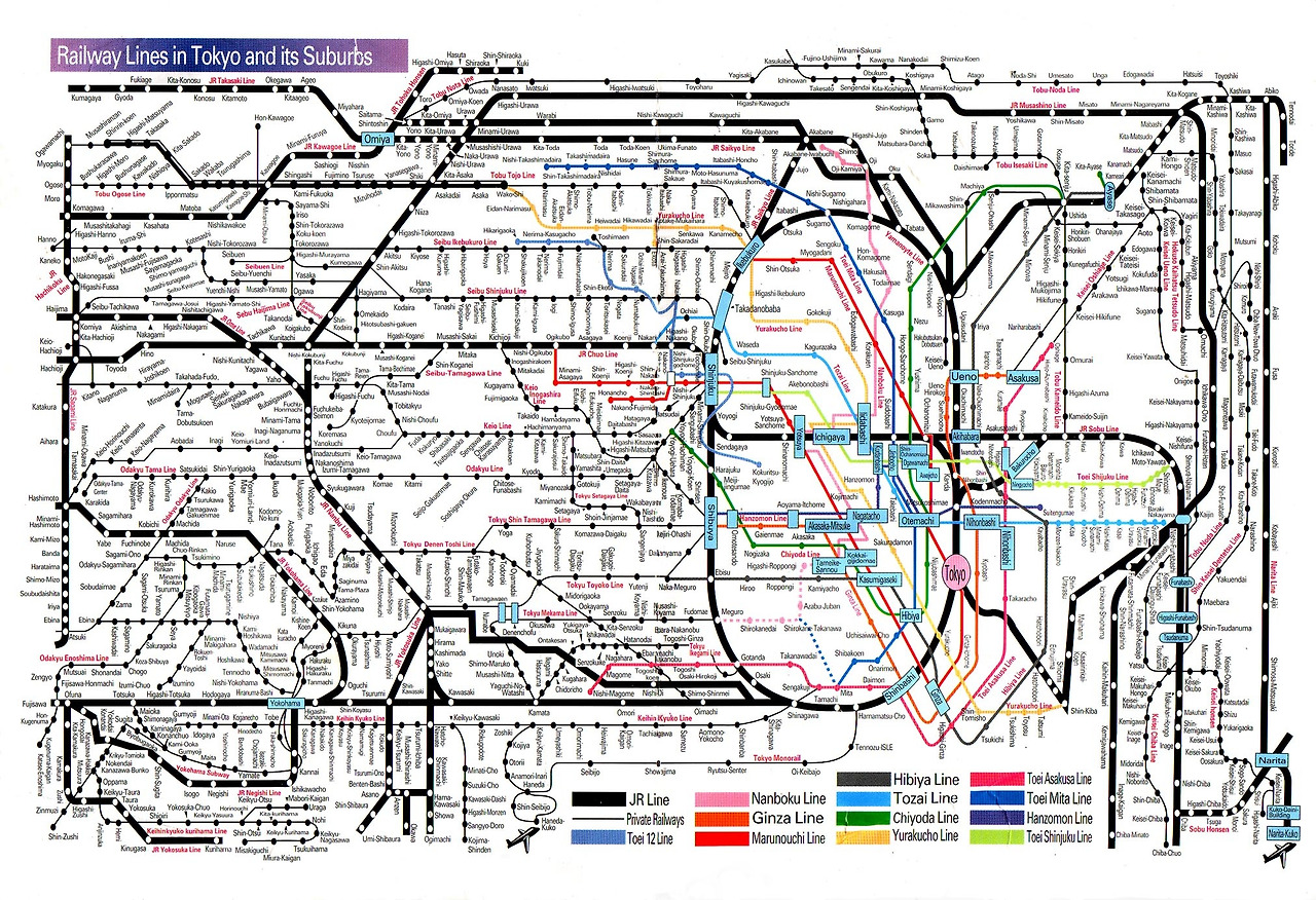 (도쿄의 철도 노선도. 일본 교통은 철도 중심이라는 것을 느낄 수 있다. 도쿄에서 생활해보면, 자동차 중심의 서울과 대전보다 확실히 더 걷게 된다. 사진출처, knowyourmeme.com)