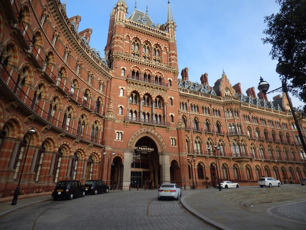 (유로스타와 유라시아 철도의 종착역인 세인트 판크라스역과 런던 킹스크로스역은 2차선 도로를 두고 마주 보고 있다. 이 고색창연한 세인트 판크라스역은 히드로 국제공항 이용자와 비슷한 년 간 6,300만 명이 이용한다. St Pancras Renaissance Hotel은 이 역사에 들어있는 호텔이다,사진 Elliott Brown,flickr)