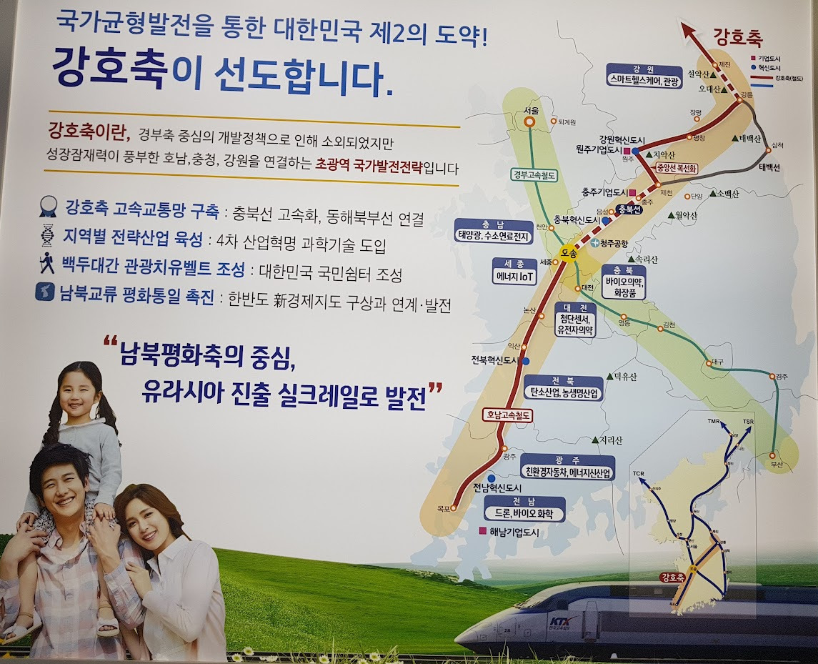 (충북 도청에 붙여있는 아래의 지리 개념도를 보면 알 수 있다. 서대전역의 호남선 상실은 교통 도시 대전이 호남 노선만을 잃어 버린 것이 아니다. 교통 분기가 서대전에서 오성으로 옮겨감으로써 강호축의 초광역 전략을 상실하는 것이다.)