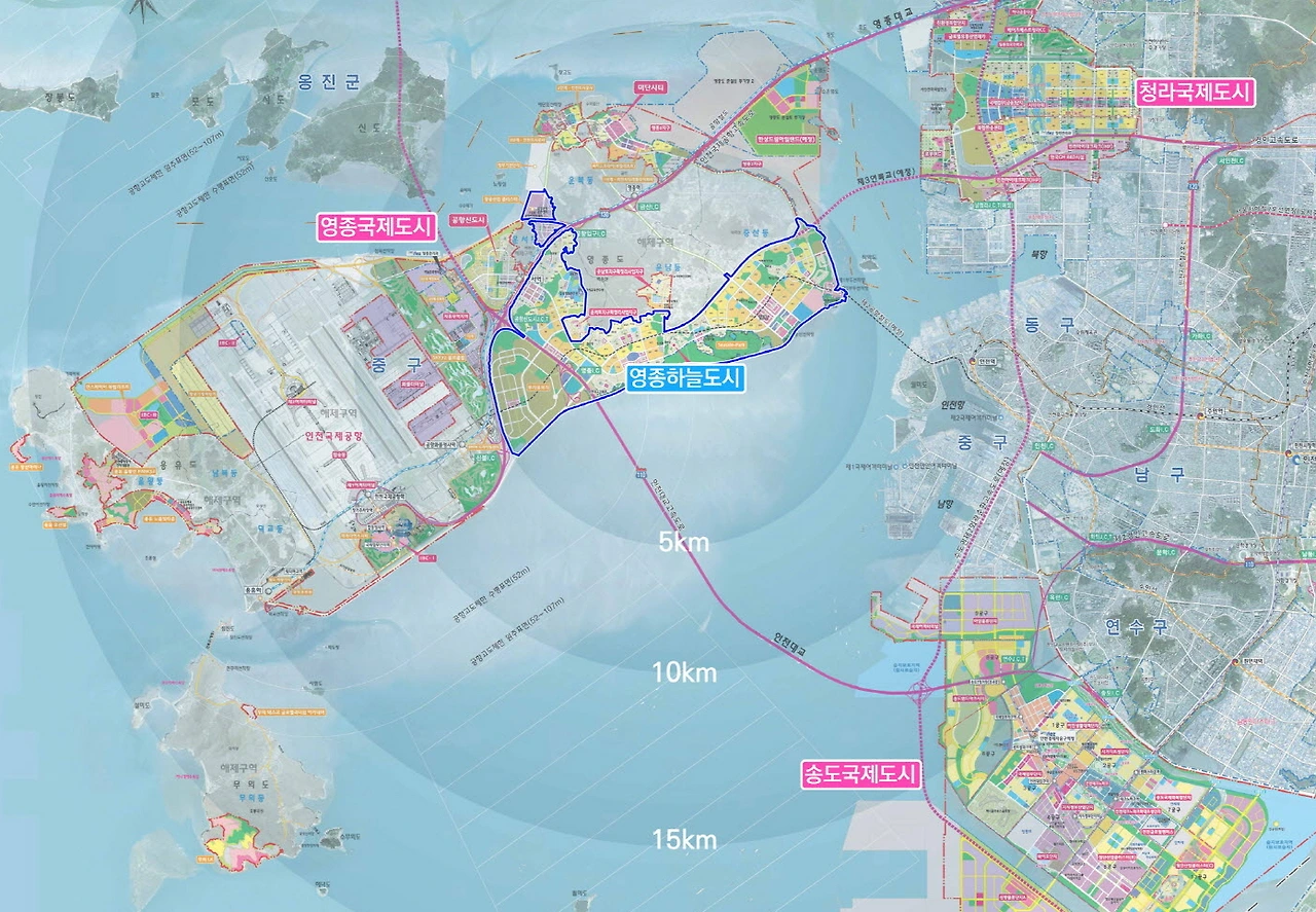 대덕구 같은 지자체는 영종도 공항도시처럼 아예 통개발해야 한다. 당시 인천시는 국제공항을 안치한 영종도를 중심으로 송도, 청라를 묶는 미래 사업을 10년 이상 진행하고 있었다. 그때 대전을 움직였던 사람들은 인천시가 가지고 있는 포부, 시각의 범위, 행정의 속도를 따라가지 못했다. 사진 출처,인천경제자유구역)