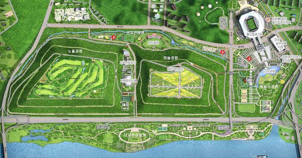사진1,2/(월드컵공원은 1978년부터 1993년까지 15년간 서울 시민이 버린 쓰레기를 처리하기 위해 생겨난 난지도 매립장의 거대한 쓰레기 산과 매립지를 2002 월드컵 개최를 계기로 270만㎡의 대규모 생태공원으로 조성한 것이다. 사진 출처, 서울시,http://parks.seoul.go.kr)