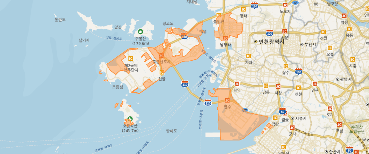 (송도, 청라, 영종국제도시 인천경제자유구역 지도. 나는 2000년 이후 상하이, 싱가포르, 두바이를 오고 가면서 위기를 느꼈다. 도시가 경제다! 그래서 한반도에도 홍콩같이 자유무역을 하는 글로벌도시 몇 개씩은 박아 넣어야 한다고 생각했다. 만약 그때 인천시가 영종도 연안이나 송도 부두에서 창고와 횟집촌을 대상으로 환경개선이나 도시정비 정도의 사업을 했다면, 지금의 인천은 어떻게 되었을까?)