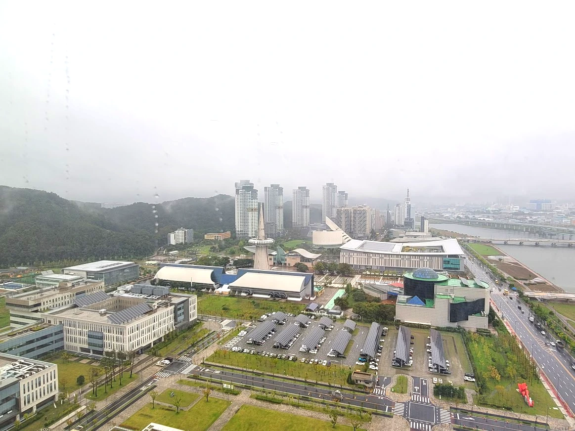 (아래 사진은 비 오는 날, 엑스포 타워 창문 안쪽에서 찍은 사진이라서 우울한 기분이 비친 것만 같다. 맹자(孟子)는 하늘의 때는 지리의 유리함만 못하다(天時不如地利)라고 했다. 전쟁을 지휘하는 병가에서 이 말을 자주 인용한다. 지리 장소는 중요하다. 그런데 엑스포과학공원 재창조사업은 ‘과학’이라는 주제로 세계적인 엑스포 테마파크를 만들 수 있는 두 번 오지 않는 기회였다. 그러나 최고의 지리(地利) 장소는 과기정통부, 문체부, 신세계라는 상이한 점령군(?)에게 너절히 분활한 사업이 되어 버렸다. 단일 이벤트에 사상 최대급 투자를 하고, 세계 각국을 비롯한 1,450만 명이 찾은 93Expo 문화유산을 지워버리면서, 인류 도약의 길을 찾기 위해 첨단 과학문화가 경합을 벌였던 역사적 장소가 단조로워졌다. 대전시가 한 것은 엑스포 기념 잔존 구역에서 한빛탑을 남기고, 대전무역전시관을 국제컨벤션으로 늘려 지은 것뿐이었다)