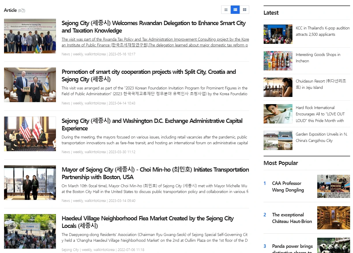 (단체장이 물꼬를 튼 국제교류는 시민, 문화예술, 기업 비즈니스까지 내려와야. 도시의 지역 경제와 국제화에 기여하게 된다. 글로벌홍보 미디어인 WalkintoKorea가 보도한 세종시 국제 교류 기사들, 2023년)