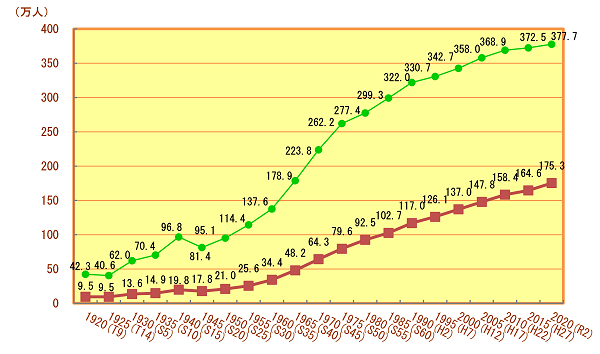 인구의 사회 증감 추이를 보면 1994~1995년에는 감소했지만 1996년 이후에는 증가해 2001(헤이세이 13)년에 23,376명이 증가했습니다.그 후에는 증가폭은 감소 경향이었지만 2012년 이후 상승세로 돌아서 2020년에는 13,481명의 사회증가를 보이고 있다.(横浜市の人口と世帯数の推移)