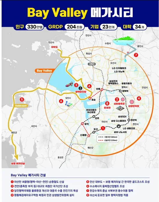 (김태흠 충남지사는 20년 당신-평택 갈등을 큰 구상으로 상쇄하며, 서해안 경제의 게임체이저가 되고 있다. 김 지사는 서해를 공유하는 충남북부권과 경기남부를 인구 330명, 지역총생산(GRDP) 204조 원, 기업 23만 개, 대학 34개를 넘는 해안경제 베이밸리(Bay Vally) 메가시티로 만들겠다는 것이다. 이것에 김동연 경기도 지사가 동의하며 맞손을 잡은 것에 주목한다. 이렇게 지역과 지역 행정을 뛰어넘는 구상과 가치 창출이 정치 본연의 일이다. 사진출처, 아산만권 베이밸리 건설 구상도. 사진출처, 힘쎈 충남 준비위)