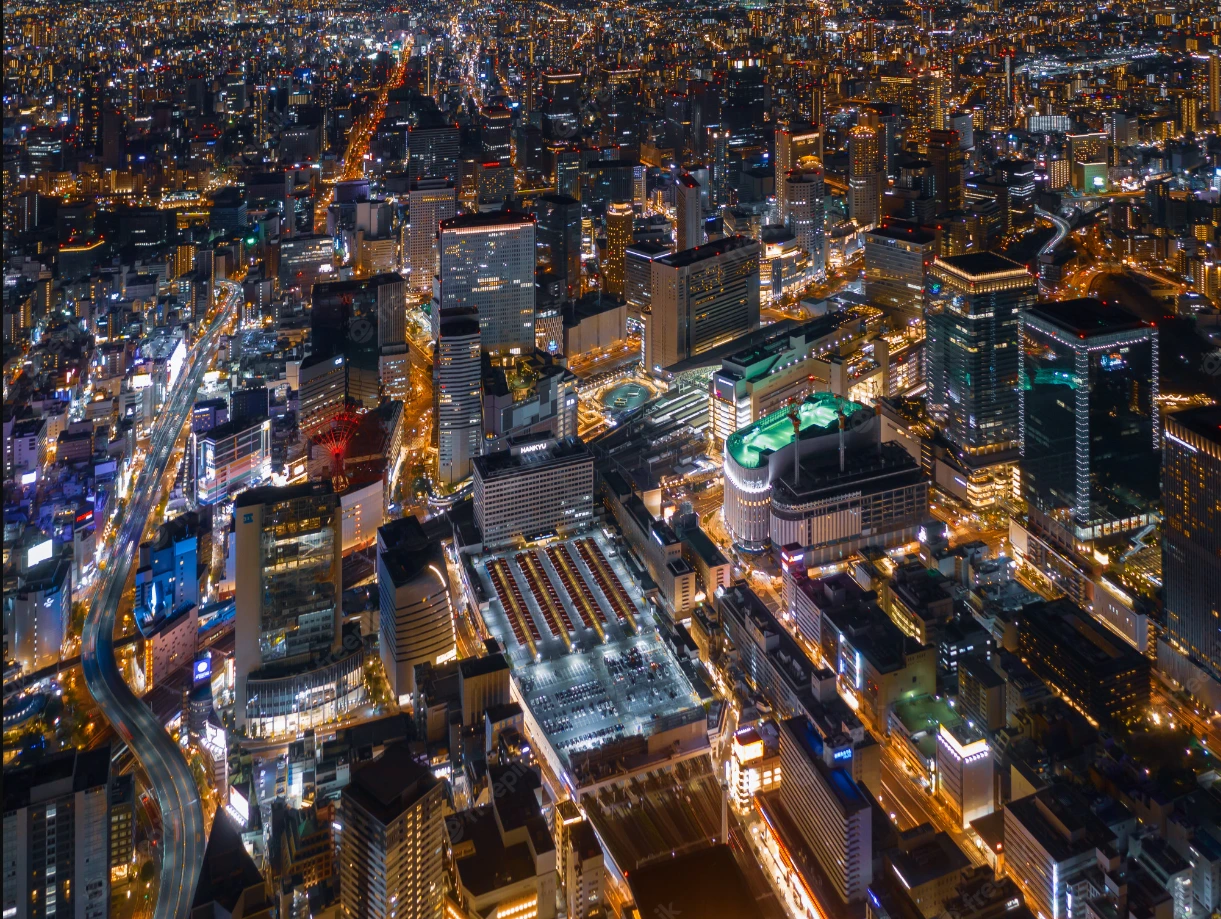 (오사카 우메다 야경, 가수 계은숙씨가 부르는 ‘오사카의 황혼(大阪暮色)’이라는 노래가 생각난다. 거대도시 오사카는 오락, 쇼핑, 문화 지구인 우메다를 품고 있다. 일류도시에는 일류지구가 있다. 허브도시는 교통뿐만이 아니라 비즈니스 편의와 유락을 제공한다. 이미지 출처 freepik)