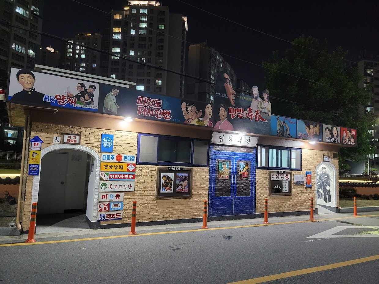 (대단히 재미있는 21세기 공중화장실, 대전시 동구 성남동 옛 평화극장 자리 인근에 공중화장실이 50년 전의 평화극장을 상기해 준다. 당시 아이들은 빠방!이라고 입장료를 내지 않고 몰래 영화 구경을 하곤 했다. 들키면 도망치고, 잡히면 꿀밤을 머리에 먹고 훈방? 되는 식으로, 가난했지만 박정하지 않았던 인심이 그립다)