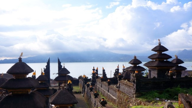 그렇게 우리는 원래의 관광 코스를 깡그리 무시하고, 뜨루냔으로 향했습니다. 뜨루냔에 가는 길에도 볼거리는 있습니다. 뜨루냔이 바뚜르(Batur) 화산 옆 바뚜르 호숫가에 위치한 마을이기 때문입니다. 얀수는 우리를 산 정상에 있는 맛 좋은 뷔페로 안내했습니다. 호수가 한눈에 내려다보이는 절경입니다. 우리는 차마 밝힐 수 없는 오물을 뒤집어쓰는 사건을 겪었는데, 마침 전망대 근처에 옷을 파는 몇몇 노점이 있네요. 셋이서 주황색 옷을 맞춰 입고 뜨루냔에 당도합니다.