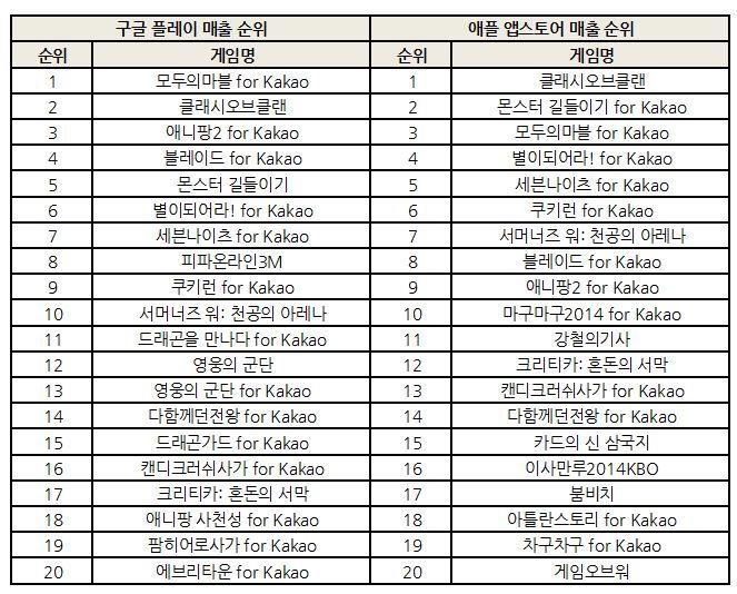 위 표를 보면 알 수 있듯이 매출 20위 안에 있는 게임들은 (1)기록 경쟁 퍼즐 게임-애니팡,