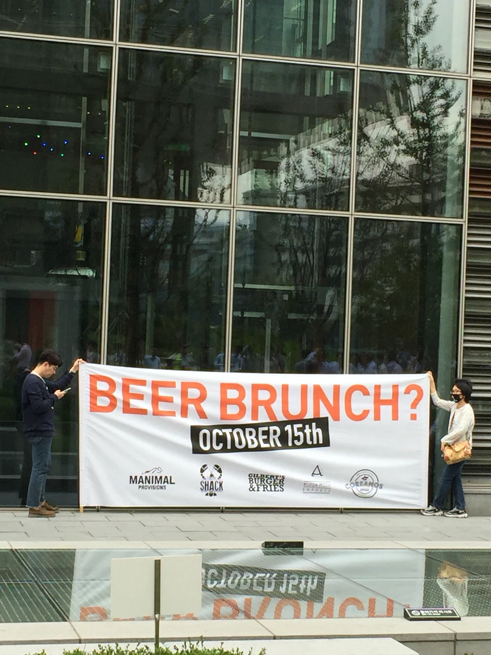 건물 외벽의 유리에 담배를 피러 나온 정장 차림의 직장인들이 비친다. 흡연구역이라지만, 지나가는 보행자들은 꼼짝없이 그 담배연기 세례를 받아야 하고, 저 현수막을 들고 있는 두 명 역시 마찬가지다.