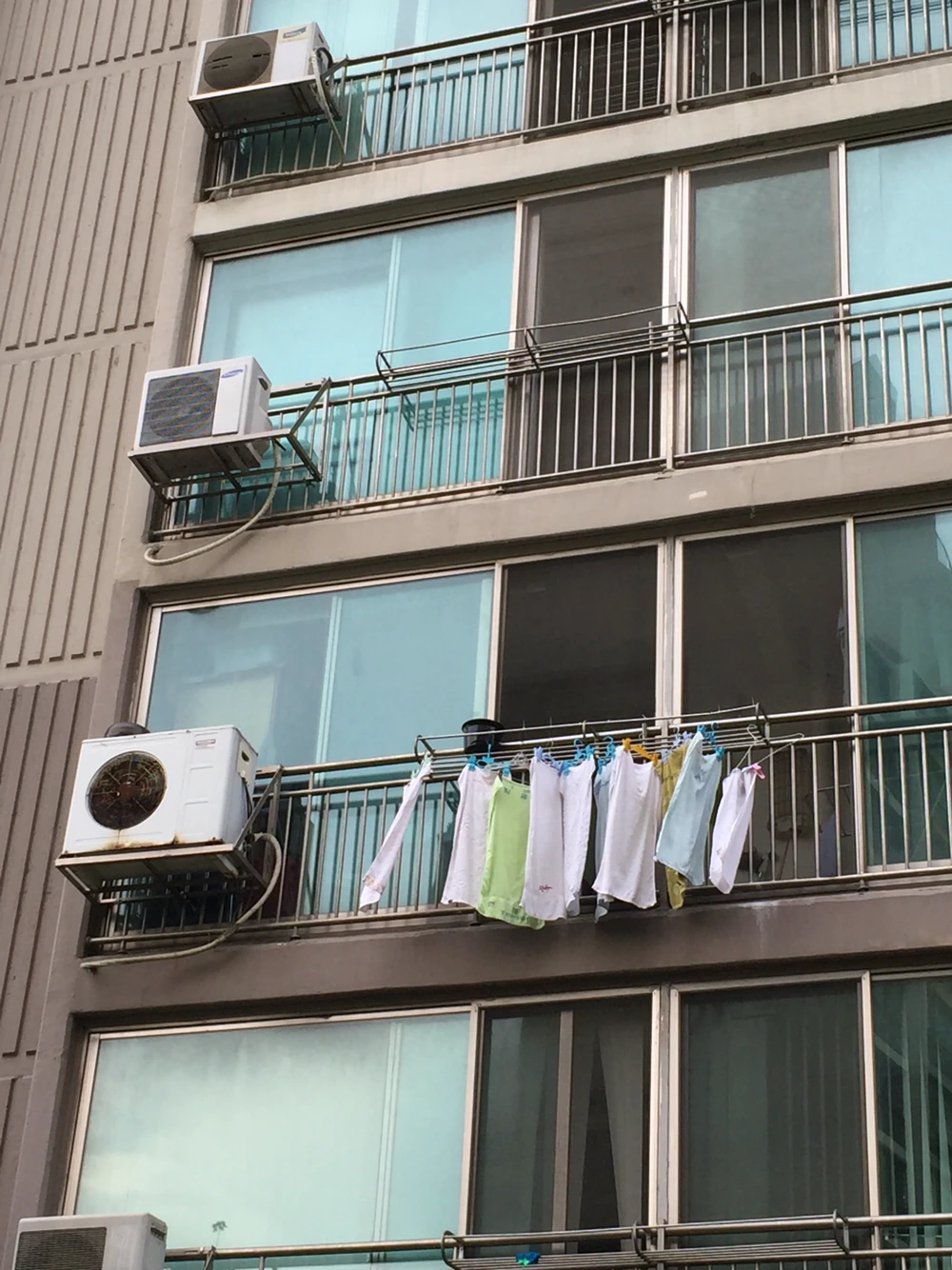 그래서 오래된 아파트에서 본 저 풍경이 너무 반가웠다. 베란다 창가에 화분을 내놓을 수 있는 화분받이가 있는 것만으로도 이 아파트의 세월을 짐작해볼 수 있다. 가지런히 널려 바람에 날리는 수건이며 내의가 정겹다. 사실 요새 아파트는 베란다를 확장형으로 한 경우가 많아 화분 하나 내놓기도 쉽지 않으니 빨래 너는 건 아예 상상도 하기 힘들다.