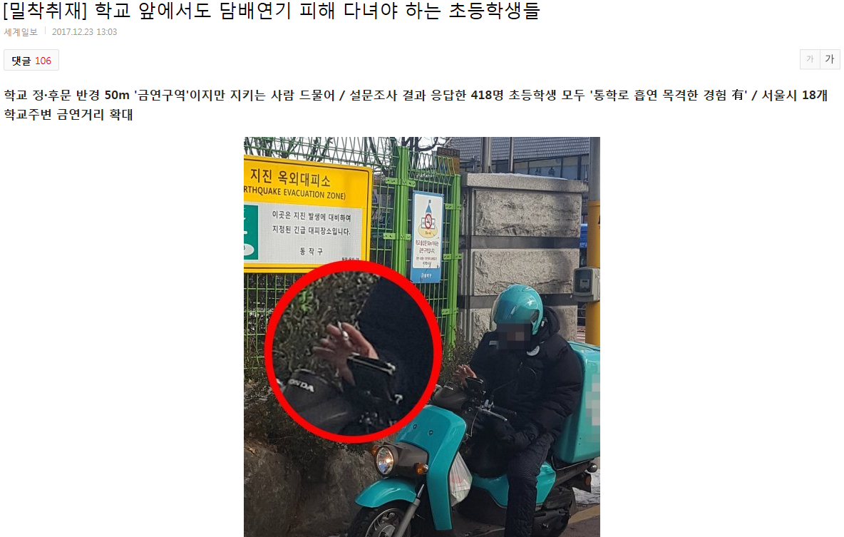 자. 다음 이야기. 23일 세계일보에 '밀착취재 학교 앞에서도 담배연기 피해 다녀야 하는 초등학생들'이라는 기사가 나왔습니다. 학교 인근에서 담배를 막 피워대는 개념없는 어른들의 이야기인데...전 이 기사를 보다가 흠칫했습니다. 네. 예시 사진으로 배달의민족이 운영하는 배민라이더스가 나오기 때문이에요.