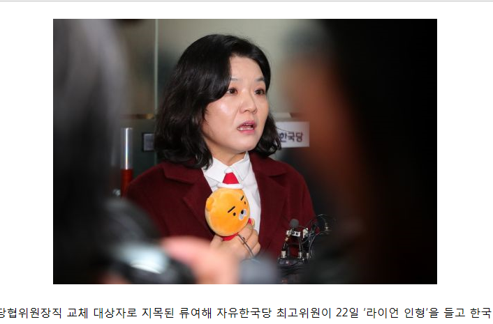 지난 22일 류여해 자유한국당 최고위원이 국회에 나타났습니다. 저는 정치적인 소신도 있고, 지지하는 정당이 있지만 이번에는 그런 이야기 하지 않겠습니다. 그냥 드라이하게 말할게요. 제가 22일 류여해 최고위원의 등장 기사를 보며 가장 관심을 가졌던 대목은 딱 하나입니다. 네. 그 분이 주머니에 카카오의 라이언 (전무) 인형을 넣고 나타났습니다.