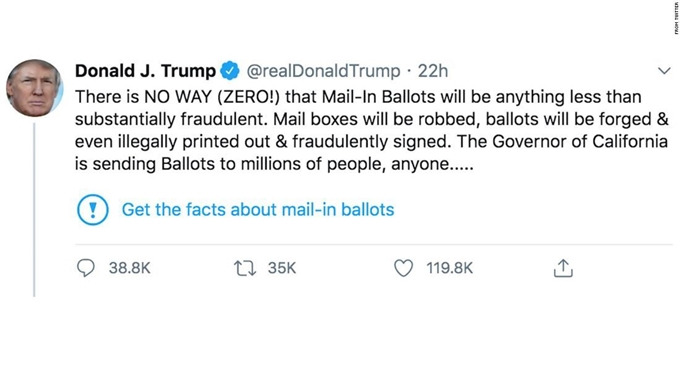 트럼프 대통령은 본인의 이러한 주장을 지난달 26일 트윗합니다. 그런데 여기서 트위터는 '사실 확인이 필요한 주장’이란 딱지를 떡 붙여 버립니다. 우편투표가 조작일 수 있다는 대통령의 트윗을 방치할 경우 잘못된 정보(misinformation)가 퍼질 수 있다는 이유입니다. 당연히 난리가 났지요. 트럼프는 “트위터는 가짜뉴스인 CNN과 아마존 워싱턴포스트의 팩트체킹을 토대로 우편투표와 관련된 내 주장이 부정확하다고 말하고 있다”면서 “트위터가 2020년 대통령 선거를 방해하고 있다"고 주장했습니다.