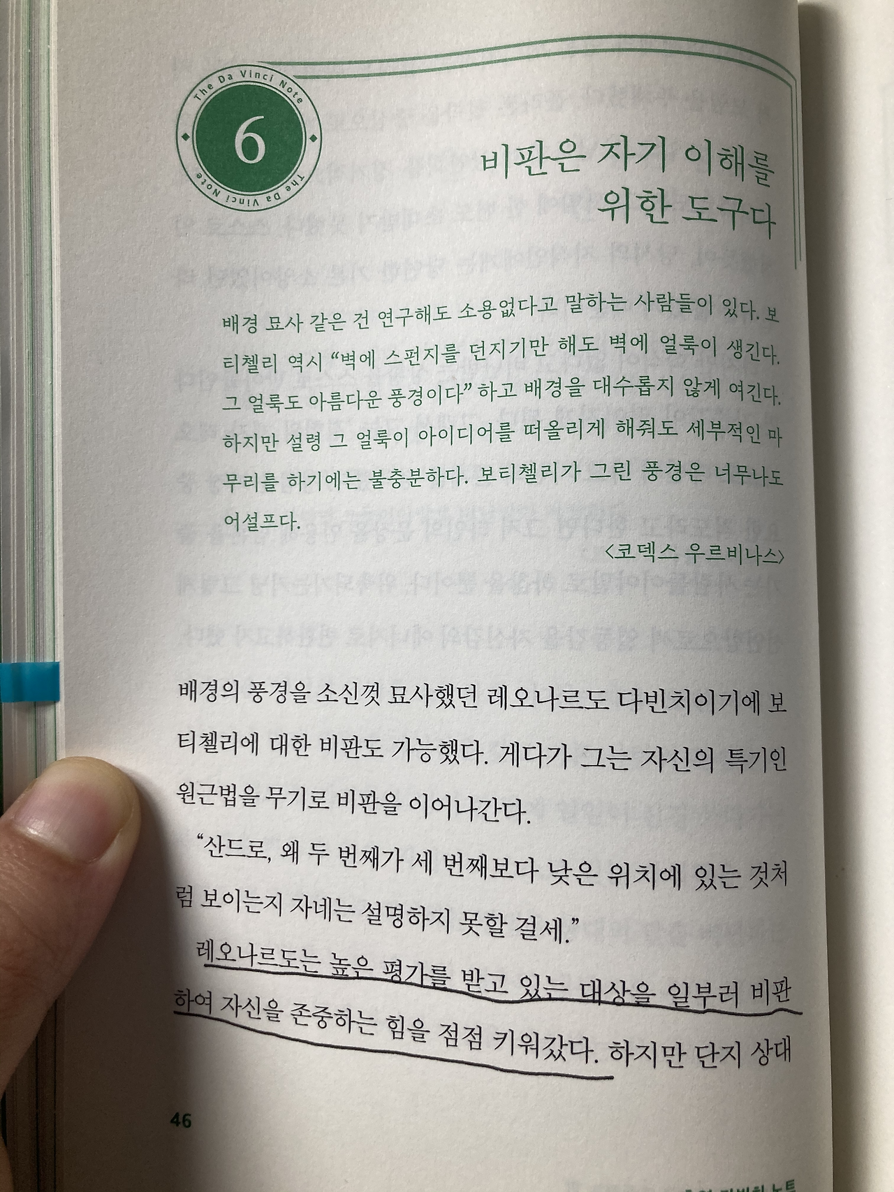 다빈치 초역 노트 챕터 1 '자신을 존중하는 힘'에 나온 내용이다. 다빈치는 타인을 높은 평가를 받고 있는 대상을 일부러 비판했다고 한다. 이를 통해 스스로를 존중하는 힘을 키웠다고. 단 중상모략이 아닌 근거 있는 비판이었다.