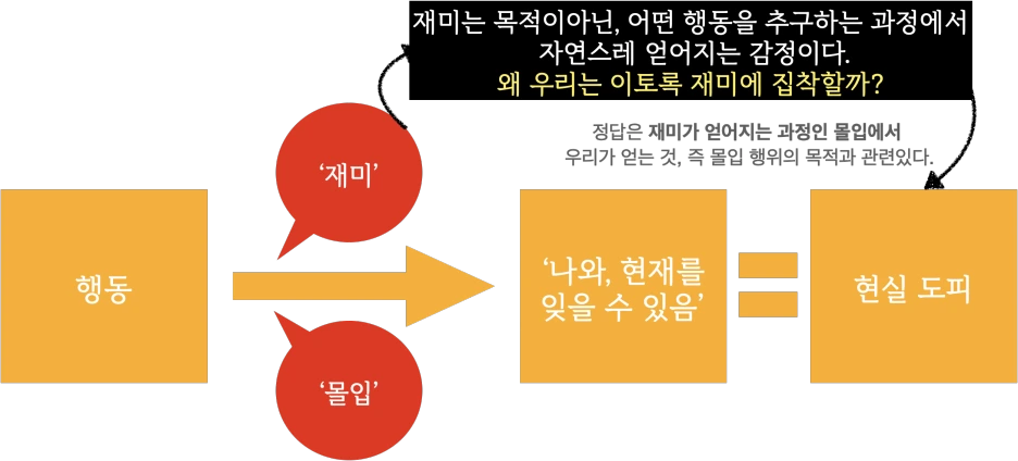 정리하면, 현재 이 순간에 벗어나기 위해 사람은 어떤 행동에 몰입한다. 그 과정에서 재미가 얻어진다. 현재 하는 행동에서재미를 느끼지 못한다는 건,제대로 몰입하지 못하고 있다는 것이다.