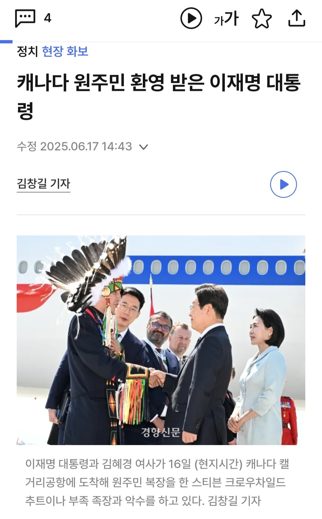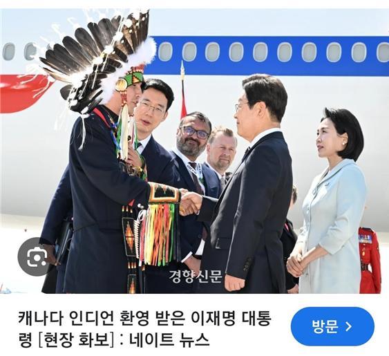 기사 제목은 ‘캐나다 인디언 환영 받은 이재명 대통령’이었다.